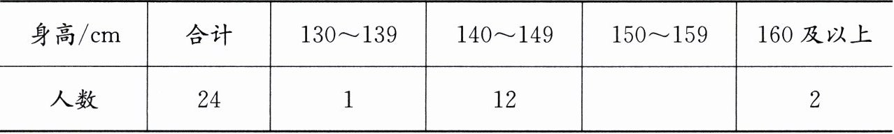 在$130 - 139$对应的上方画直条,高度为$1$;在$140 - 149$对应的上方画直条,高度为$12$;在$150 - 159$对应的上方画直条,高度为($24 - 1 - 12 - 2=9$);在$160$及以上对应的上方画直条,高度为$2$。