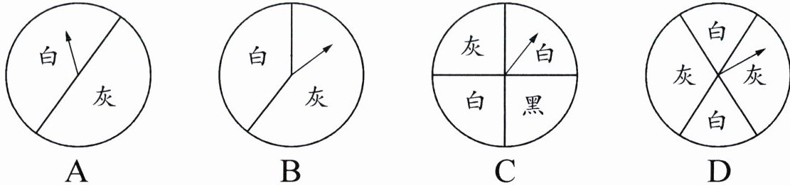 7. 如图,有 A、B、C、D 四个转盘。小磊和小辉做转盘游戏,指针停在灰色区域算小磊赢,停在白色区域算小辉赢。