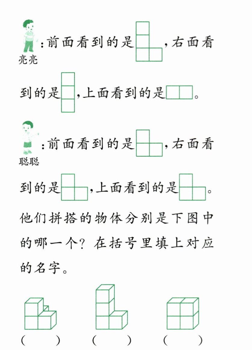 5. 红红、亮亮、聪聪分别用4个同样大的正方体摆物体,下面是他们从物体的前面、右面和上面观察到的图形。