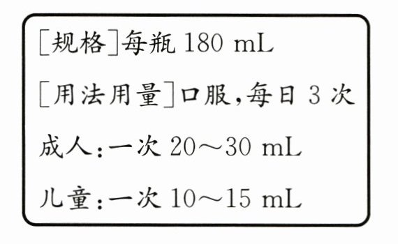 例 2:实验小学四(1)班的彤彤感冒咳嗽,妈妈买了一瓶止咳糖浆,规格和用法用量说明如下图。这瓶糖浆最多够彤彤服用多少天?