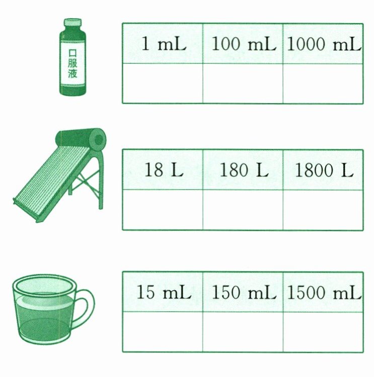 例 1:下面各容器的容量大约是多少?在合适的答案下面画“√”。