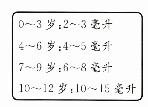 2. 一种感冒药,每瓶装 150 毫升药液,每次用量说明如下图。小军 11 岁,他喝完一瓶这种感冒药最少要多少次?最多要多少次?