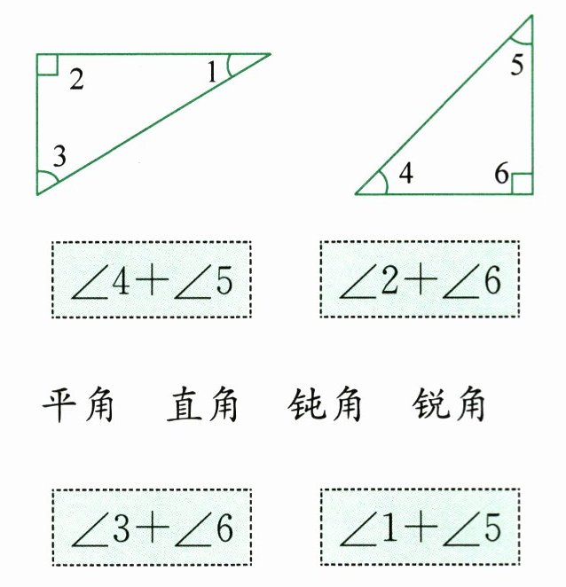 ∠4+∠5-直角;∠2+∠6-平角;∠3+∠6-钝角;∠1+∠5-锐角