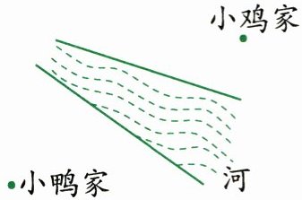 根据垂线段最短的原理,从小鸭家向河岸作垂线,再从河的另一边向小鸡家作垂线(或从小鸭家作垂线到对岸后直线到达小鸡家更简短直观时,以直接垂直连接并延伸至小鸡家为准),画出路线: