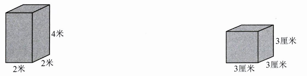 2. 每个小方格的边长是 1 厘米,计算正方体、长方体的表面积和体积。