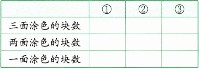 (1)①、②、③中,三面、两面、一面涂色的小正方体各有多少块?填写下表。