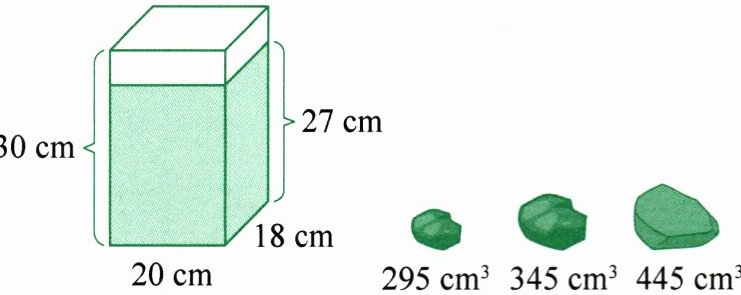 1. 如图,有一个无盖的长方体水槽,里面盛有一定量的水,水面高度为$27$厘米。水槽的旁边有三块石头,体积分别是$295$立方厘米、$345立方厘米和445$立方厘米。把这三块石头都放在水槽里,水会溢出吗?请说明理由。
