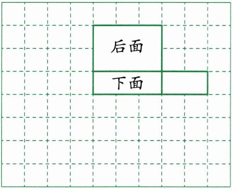 在“下面”面的右边一列与“后面”对齐的位置画一个与“下面”相同大小的面作为“前面”;在“下面”面的正下方一行与“后面”对齐的位置画一个与“下面”相同大小的面作为“上面”;在“后面”面的正下方一行与“下面”同列的位置画一个与“下面”相同大小的面作为“后面”的对面(可标注“前面”对应的背面逻辑位置,实际绘制相同大小面),即补全长方体展开图的另外三个面。 (以方格纸实际绘制为准,保证相对面大小形状相同且位置符合长方体展开图特征)。