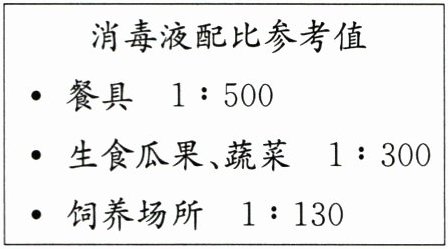 (2) 饲养场所消毒原液与清水配比为$1:130$,则原液占消毒液的$\frac{1}{1 + 130}$。