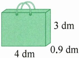 【解析】:一个手提袋表面积:$4×0.9 + 4×3×2 + 0.9×3×2 = 3.6 + 24 + 5.4 = 33$(平方分米),20个手提袋面积:$33×20 = 660$(平方分米)
