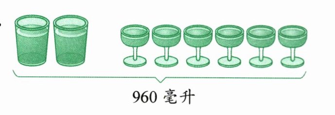 如图,晨晨把果汁倒入两种杯子中,小杯和大杯的容量之比是$1:3$。小杯和大杯的容量各是多少?