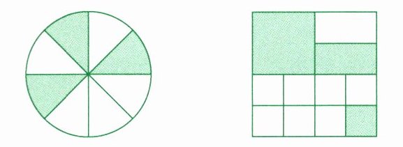 4. 下面每个图形都表示“1”,分别用分数、小数和百分数表示图中的涂色部分。