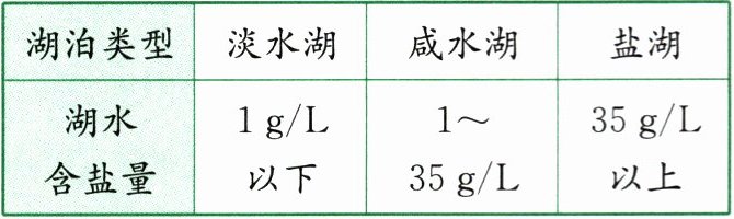 7. 我国湖泊众多,共有 24800 多个。按照湖水中盐分含量的差异,湖泊的分类标准如下表。