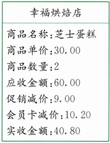 8. 幸福烘焙店进行促销活动,所有商品一律八五折。赵阿姨买了两盒芝士蛋糕,下图是她使用会员卡结算的账单。赵阿姨的会员卡是打(