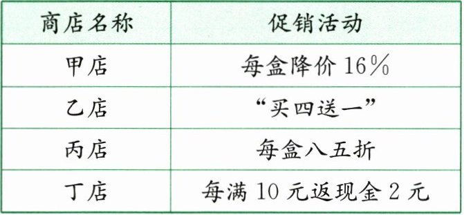 4. 甲、乙、丙、丁四家商店均在进行促销活动,原价每盒$3$元的某种饮料,小明要买$5$盒,去(