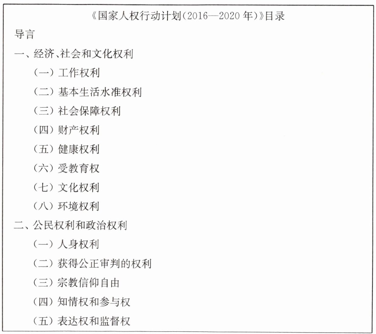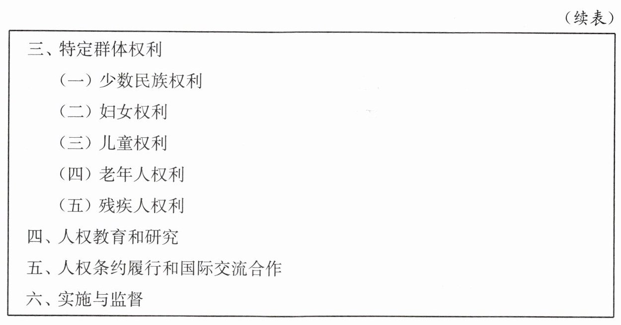 请你对照下面《国家人权行动计划(2016—2020年)》目录,分析下列图片分别体现的人权,填写在相应表格中。
