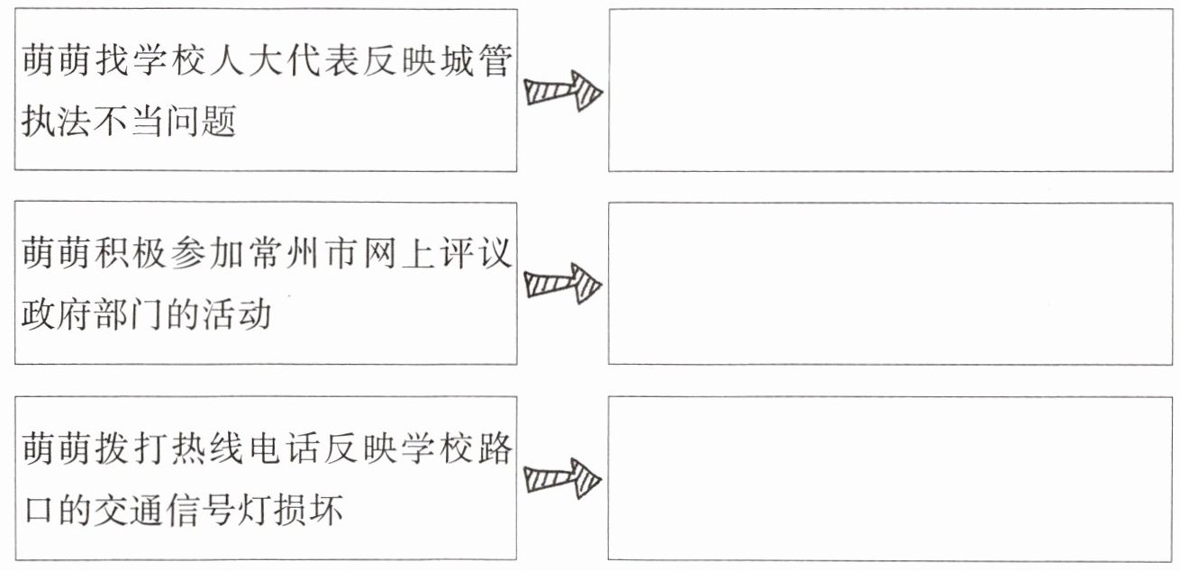 以下是小学生萌萌在学习了《道德与法治》课后,积极在社会中实践的行动。请你想一想,她采用了哪些监督方式?请在后面方框内填写完整。