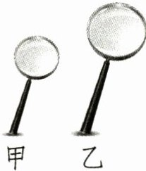 4. 如右图所示,放大镜甲的镜片直径是三厘米,放大镜乙的镜片直径是五厘米,它们的镜片凸度是一样的,它们的放大倍数是( )大。