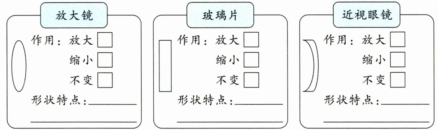1. 小胡是一个喜欢探索的学生,她从家中找来放大镜、玻璃片和近视眼镜,请在下列方框中分别勾选出对应镜片的作用和形状特点,最后她决定选取______来搜集物证。