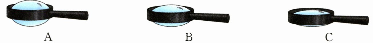 2. 下图中的三个放大镜中,放大倍数最高的是______(填字母)。说明放大镜的放大倍数与镜片的______有关。镜片的______,物体图像放大的倍数越______。