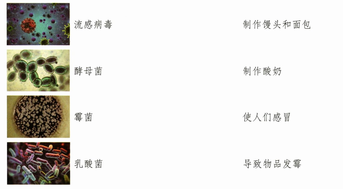 流感病毒-使人们感冒;酵母菌-制作馒头和面包;霉菌-导致物品发霉;乳酸菌-制作酸奶