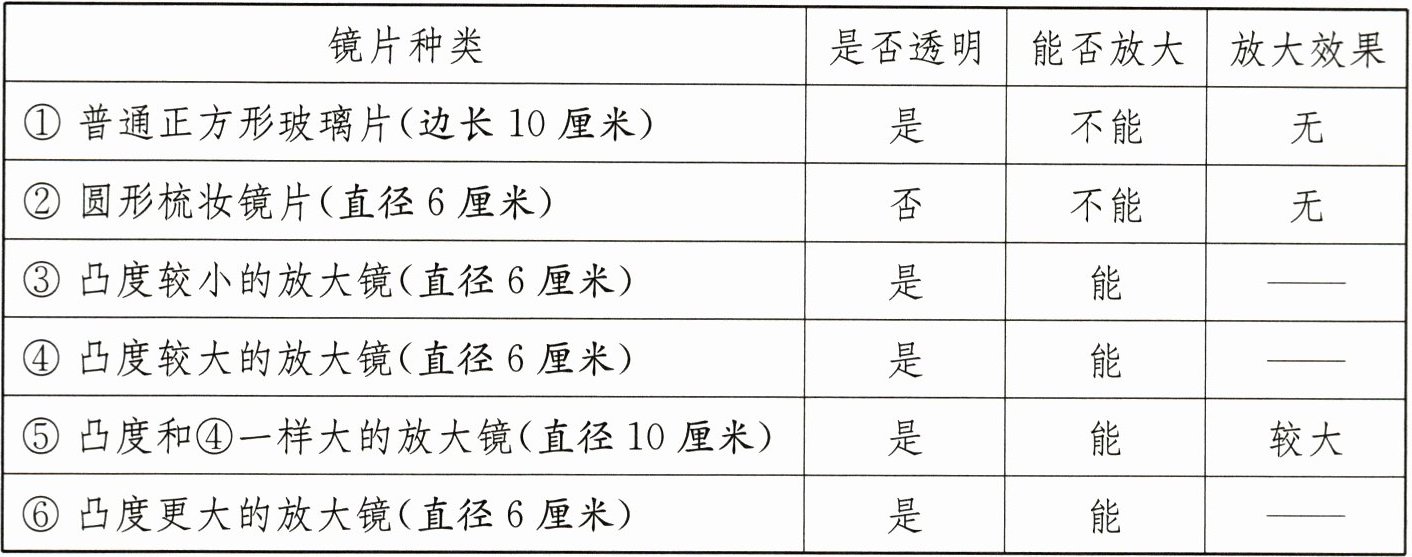 持式放大镜”或“台式放大镜”)。2. 请根据放大镜的结构特点,自制一个放大镜。你可以选取哪些材料来制作放大镜呢?怎样制作?如何检验你制作的放大镜是否具有放大作用呢?______