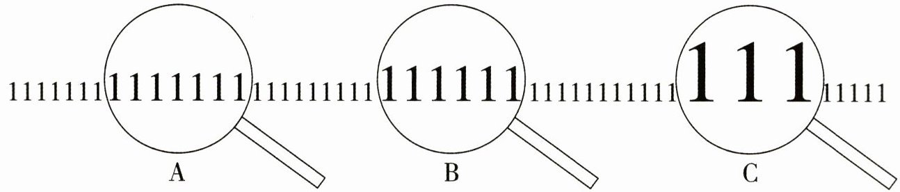 1. 请根据下图中 A、B、C 三个放大镜的放大效果,将下图中的字母分别填写在上表对应的表格中。