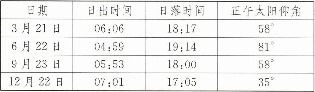 请你观察下图所示的南京地区日出、日落时间和正午太阳高度的变化表,回答下面问题。