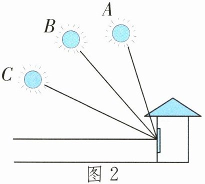 2. 为了更好地进行模拟实验,同学们查阅了当地一年四季______时分的太阳位置(如图 2)。其中 A 代表的是______的太阳位置;B 代表的是______的太阳位置;C 代表的是______的太阳位置。