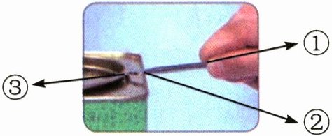 ①向下压的一端 ②靠在桶边缘的地方 ③插入盖子下面的部分