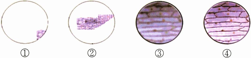 1. 上图是小芳用显微镜观察洋葱表皮玻片标本时做的一系列操作,其中①→②的操作是______;②→③的操作是______;③→④的操作是______。