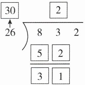 (1) 笑笑在商的十位上商 2,商(大 小)了。请你调整后,把新的竖式写在右面,并算出$832÷26$的最后结果。