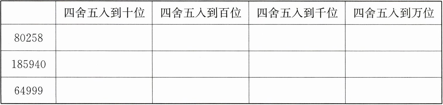 | | 四舍五入到十位 | 四舍五入到百位 | 四舍五入到千位 | 四舍五入到万位 |