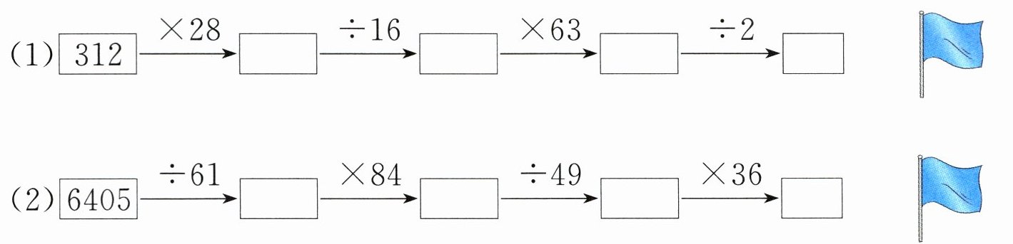 (2)$\boxed{6405}\xrightarrow{÷61}\boxed{}\xrightarrow{×84}\boxed{}\xrightarrow{÷49}\boxed{}\xrightarrow{×36}\boxed{}$