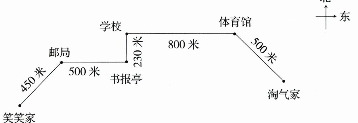 (2)东北,450,邮局,东,500,书报亭,北,230