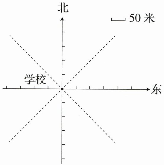 (1)文具店位于学校北面150米处,以学校为中心,向上(北方向)数3个单位(每个单位50米),用△标记。