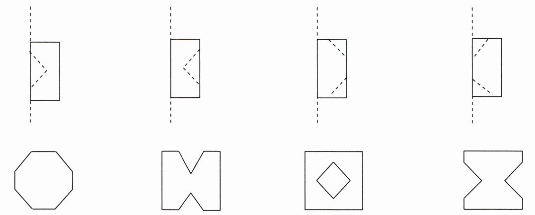8. 将纸像这样对折后,像下面四幅图那样沿虚线剪下,剩下的纸打开后是什么图形?与第二行的图形连一连。