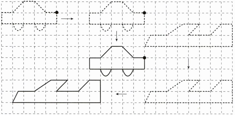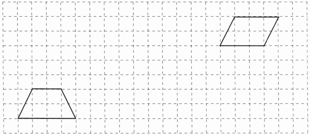 (2)梯形:原位置最上面顶点在左数第一行第一个格的交点处,先向右平移3格,再向上平移5格,即新图形最上面顶点在左数第四行(从下往上数第七行)第四个格的交点处,依此画出平移后图形。