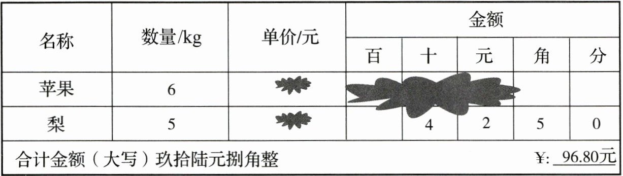 $\begin{cases}96.8 - 42.5 = 54.3(元) \\54.3÷6 = 9.05(元) \\答:平均每千克苹果9.05元。\end{cases}$