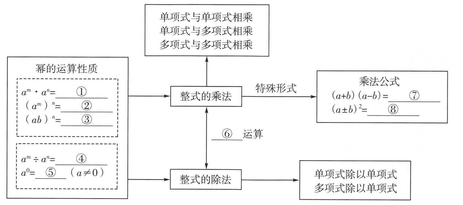 ①$a^{m+n}$ ②$a^{mn}$ ③$a^{n}b^{n}$ ④$a^{m-n}$ ⑤1 ⑥互逆 ⑦$a^{2}-b^{2}$ ⑧$a^{2}\pm 2ab+b^{2}$