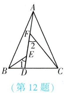12. (★★) 如图,在△ABC 中,AB = AC,AB > BC,点 D 在边 BC 上,CD = 2BD,点 E,F 在线段 AD 上,∠1 = ∠2 = ∠BAC,若△ABC 的面积为 18,则△ACF 与△BDE 的面积之和是【