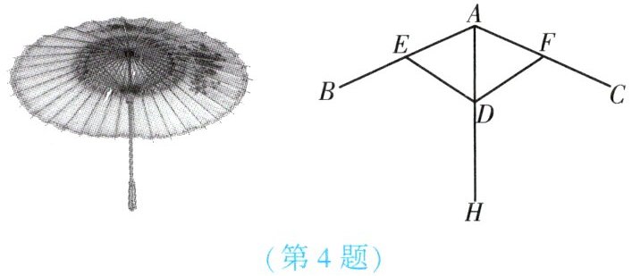 4. (★) 某中学八年级同学在听了“天宫课堂”第三课后,组成了数学兴趣小组进行了设计伞的实践活动. 康康所在的小组设计了截面如图所示的伞骨结构,当伞完全打开后,测得AB = AC,E,F分别是AB,AC的中点,ED = DF,那么△AED ≌ △AFD的依据是【