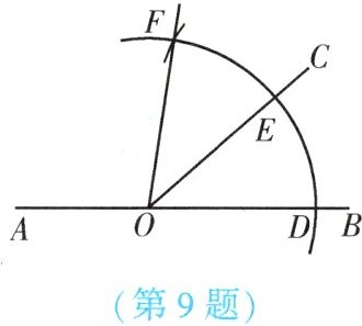 9.(★)如图,在直线AB上取一点0,过点0作射线OC,使∠BOC=41°,以点0为圆心,任意长为半径作弧,分别交OB,0C于点D,E,再以点E为圆心,DE为半径作弧,与上一步作的弧(∠BOC 外部)相交于点F,作射线OF.则LAOF的度数为