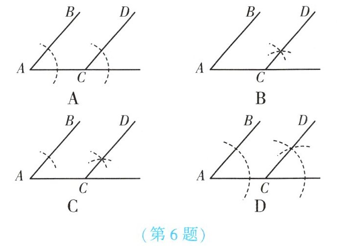 6. (★)如图,$C是∠BAC的边AC$上一点,利用直尺和圆规作一条射线$CD$,使$CD// AB$。下列作图方法正确的是【