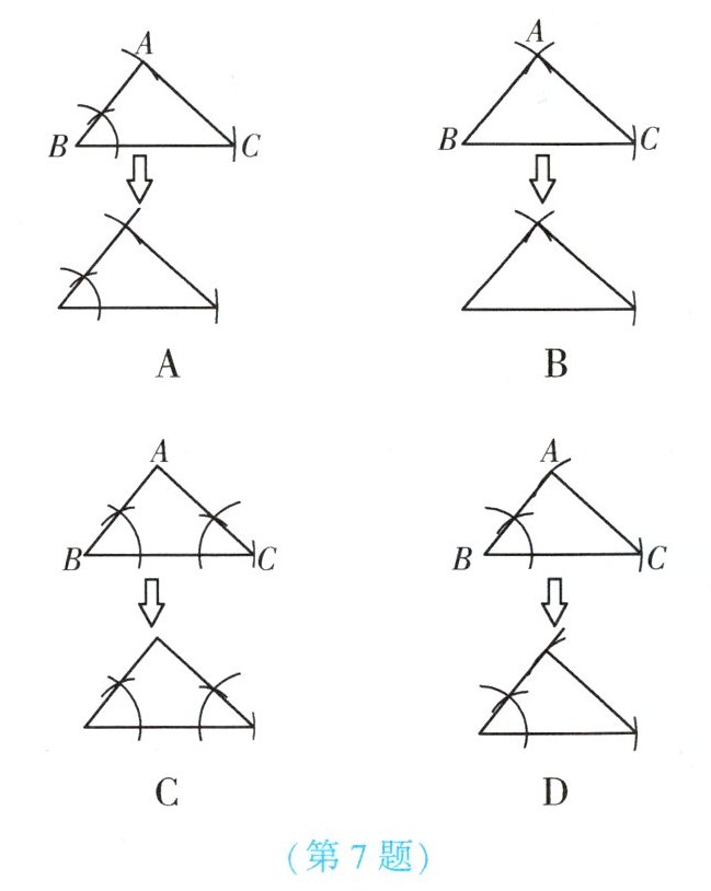 7. (★★)小明同学在学习了利用直尺和圆规作一个三角形与已知三角形全等后,尝试用不同的方法作三角形,如图,不一定与$\triangle ABC$全等的是【