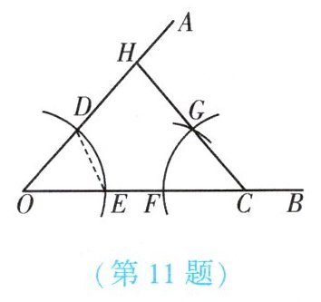 11.(★★)如图,已知∠AOB=α,C为射线OB上一点,利用直尺和圆规按如下步骤作图:①以点0为圆心,以任意长为半径作弧,分别交OA,OB于点D,E;②以点C为圆心,OD为半径作弧,交OC于点F;③以点F为圆心,DE为半径作弧,与上一步作的弧相交于点G;④连接CG并延长交OA于点H.则∠AHC的度数为[]
