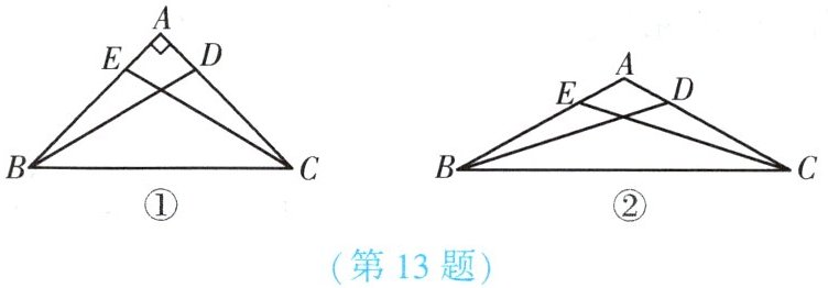 13. (★★★)(1)如图①,在△ABC中,∠BAC= 90°,AB= AC,点D,E分别在边AC,AB上.若CE= BD,则线段AE和线段AD之间的数量关系是___.