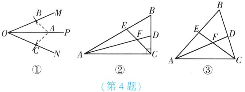 4. (★★) 如图①, $ OP $ 是 $ \angle MON $ 的平分线, $ A $ 是 $ OP $ 上任意一点,用圆规分别在 $ OM $, $ ON $ 上截取 $ OB $, $ OC $,且 $ OB = OC $,连接 $ AB $, $ AC $,则 $ \triangle AOB \cong \triangle AOC $,判定方法是