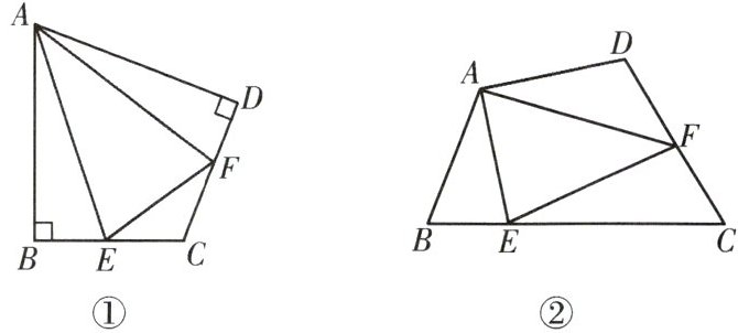 (1) 为探究上述问题,小王同学先画出了其中一种特殊情况,如图①。当 $ \angle B = \angle D = 90° $ 时,延长 $ FD $ 至点 $ G $,使 $ DG = BE $,连接 $ AG $。