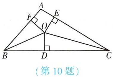 10. (★)如图,O是△ABC内一点,且点O到三边AB,AC,BC的距离相等,即OF= OE= OD.若∠BAC= 100°,则∠BOC的度数是【